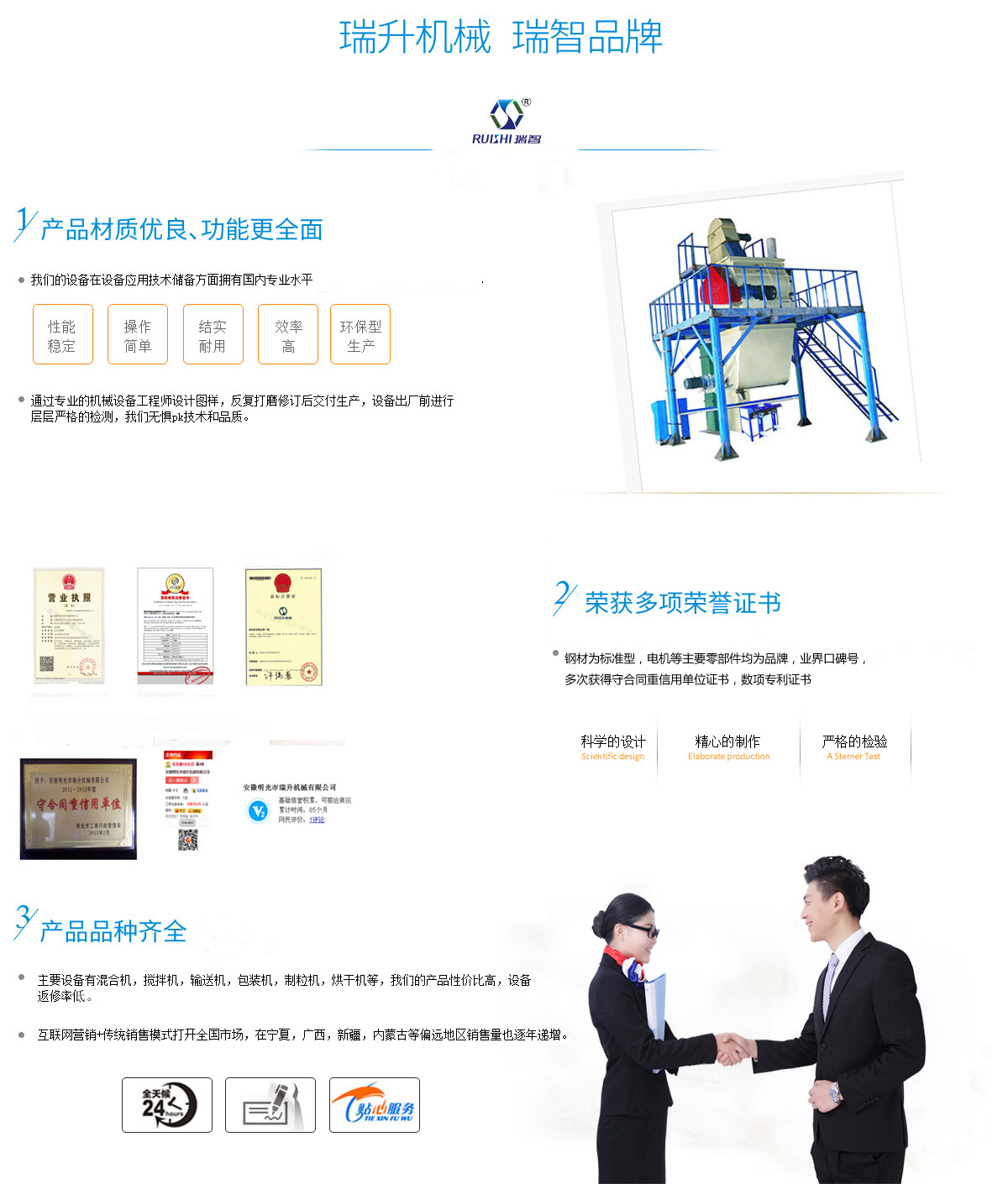 安徽瑞升機(jī)械制造有限公司坐落在明光市工業(yè)園區(qū),本公司產(chǎn)品主要用于粉料物質(zhì),顆粒物質(zhì)的混合、攪拌、輸送、包裝的自動(dòng)化生產(chǎn)設(shè)備。工廠占地面積為1萬多平方現(xiàn)有6000平方米的生產(chǎn)車間和各類加工檢測(cè)設(shè)備,具備產(chǎn)品開發(fā)、研制、設(shè)計(jì)、生產(chǎn)、試驗(yàn)、倉(cāng)儲(chǔ)運(yùn)輸?shù)饶芰Γ梢陨a(chǎn)多種規(guī)格、多種非標(biāo)定制的產(chǎn)品,并有多項(xiàng)技術(shù)獲得國(guó)家專利,擁有自主進(jìn)出口權(quán),公司憑借優(yōu)良的技術(shù)、先進(jìn)的工藝和科學(xué)的管理理念,所生產(chǎn)的產(chǎn)品已暢銷全國(guó)各地,部分產(chǎn)品已進(jìn)入馬耳他、印度尼西亞、韓國(guó)、羅馬尼亞、沙特阿拉伯、馬來西亞、印度、巴基斯坦、等國(guó)家和地區(qū),受到國(guó)內(nèi)外客戶的高度認(rèn)可和信賴。 本公司獲得守合同重信用單位證書,對(duì)原材料的采購(gòu)極為細(xì)致,鋼材為標(biāo)準(zhǔn)型,電機(jī)等主要零部件均為品牌,數(shù)項(xiàng)專利證書。技術(shù)方面我司擁有一支國(guó)內(nèi)的技術(shù)和管理團(tuán)隊(duì),在機(jī)械設(shè)備應(yīng)用...公司資質(zhì)榮譽(yù)